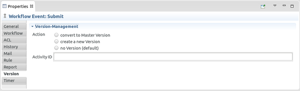 The section ‘Version’ defines if a new version of a process instance should be created by the event. Versions are used to archive a process instance or to create a copy of a workitem.