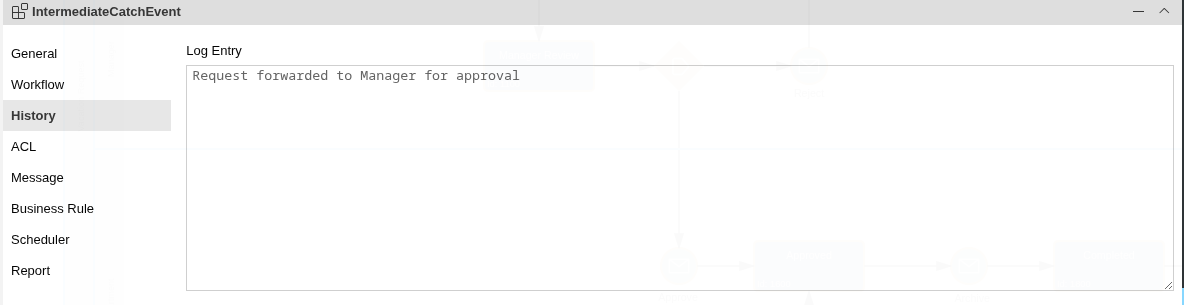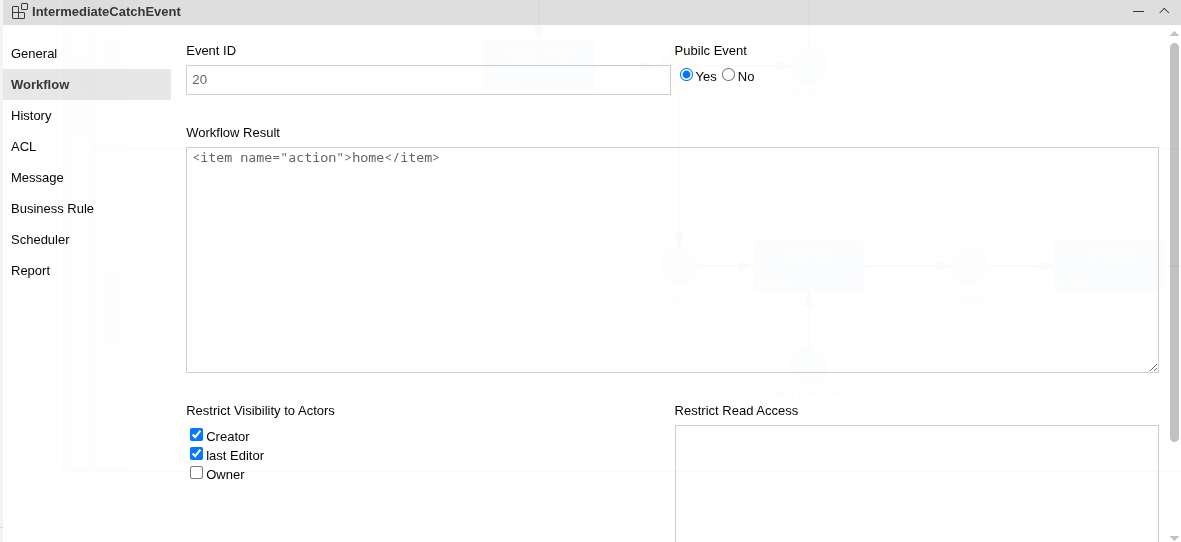A ‘Public Event’ can be restricted to a specific group of users depending on the state of a workflow instance. The restriction is based on the ‘Actor Properties’ which are defined by the process properties of the workflow model. If a restriction is set the event is only visible to the workflow user if the userid is listed in one of the Actor Properties. With the restriction feature, the visibility of a workflow event can be configured on a very fine grained level.