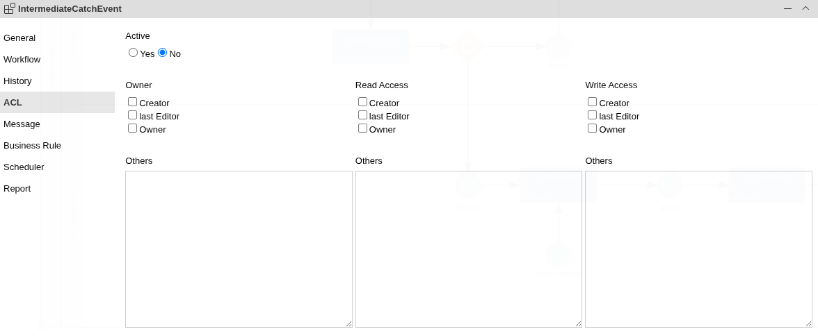 The ACL Mapping is used to map a property of the process instance to the ACL. The mapping list can be defined by the Process Property Editor.