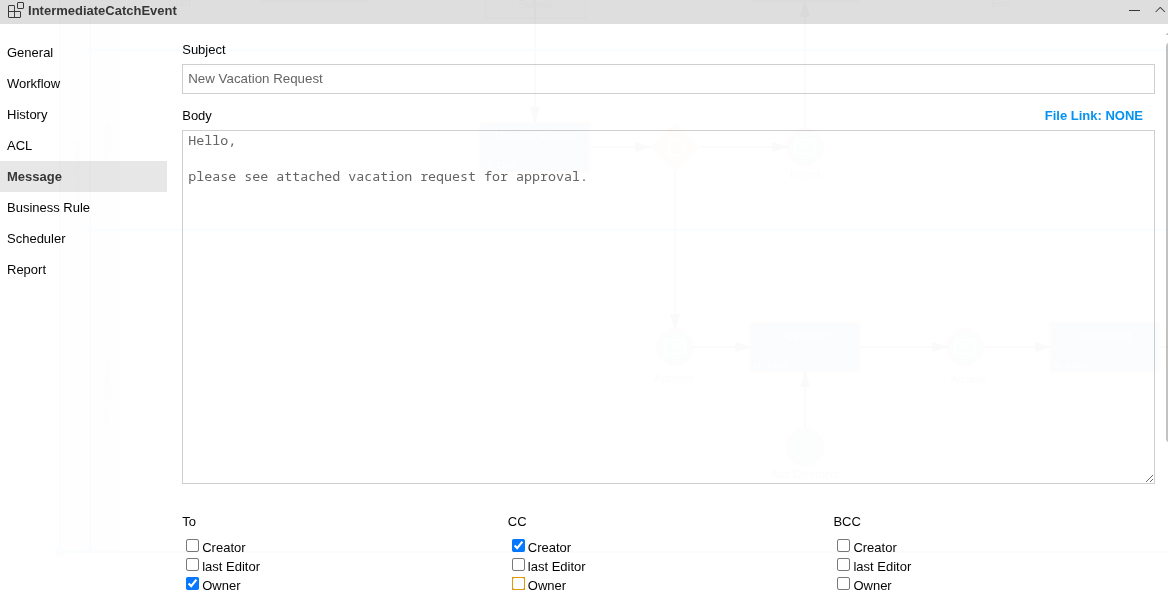 A mail message is defined by the mail subject and mail body. Both fields support the Text Replacer feature. A mail message can define different recipients in the sections ‘To’, ‘CC’ and ‘BCC’. See the section Process Property Editor for more information how to define Actors in an Imixs BPMN model.