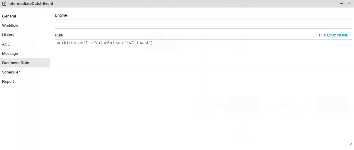 The Imixs-BPMN Event element is an extension to the BPMN 2.0 Intermediate Catch Event. This element describes the transition from one Task into another. The Event Element contains various properties which are evaluated during the execution by the Imixs-Workflow engine.