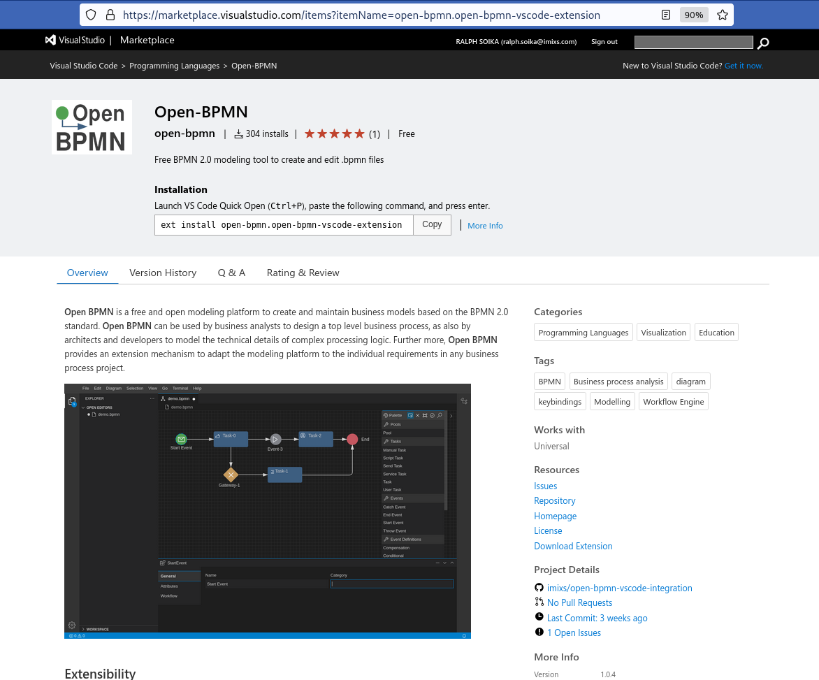Visual Studio Code (VS-Code) is a popular, lightweight editor that fully supports the Open-BPMN modeling suite through its extension mechanism.